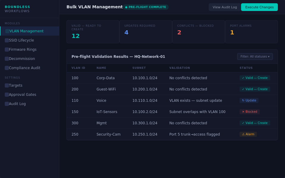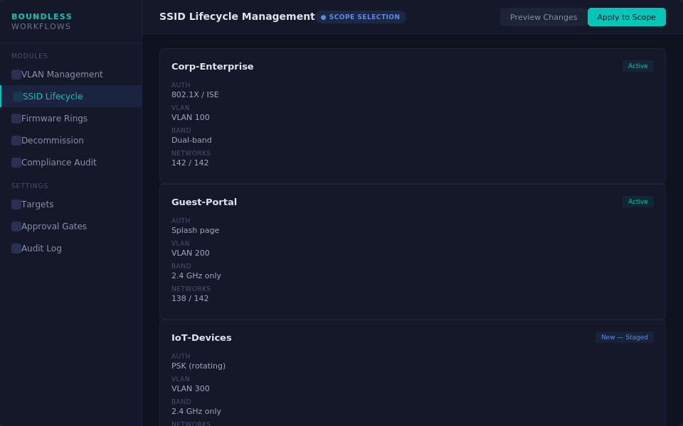 Manage wireless network creation, modification, and decommissioning with tag-scoped targeting. Enforce naming conventions, security policy standards, and RADIUS/ISE integration requirements across selected network groups.