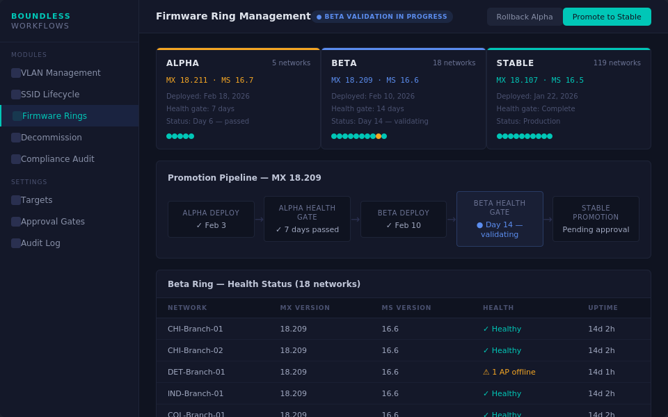 Firmware Ring Management Staged firmware rollouts using alpha/beta/stable designation patterns. Tag-based network grouping, firmware version compatibility checks, health gate validation between stages, and phased rollback if issues are detected. Designed for organizations that can’t afford to upgrade all sites simultaneously.